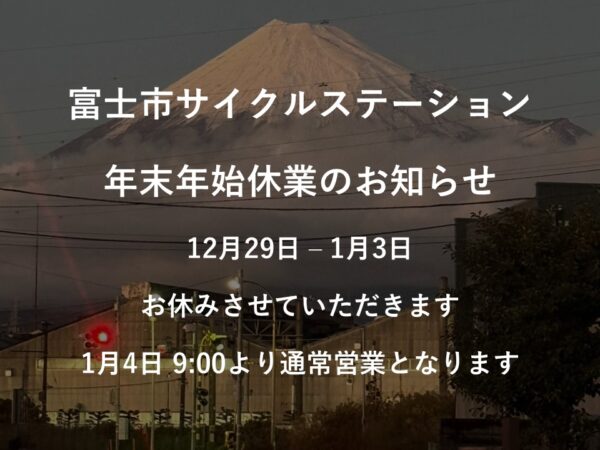 2025/12/28 年末年始休業のお知らせ 【年末年始休業のお知らせ】 2025年12月29日-2026年1月3日 は、年末年始休業のためお休みさせていただきます。 2025年もたくさんの皆様にレンタサイクルををご利用いただき有難うございました。2026年も何卒よろしくお願い致します。 この記事をシェアする Twitter Facebook LINE 前の記事へ 一覧へ戻る